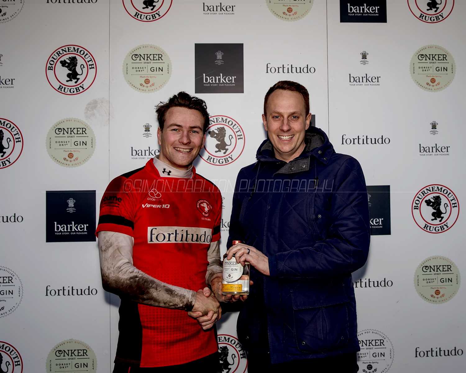 Freddie Gleadowe man of the match present with Conker Gin by match sponsor Finch Group. Photo by Simon Carlton